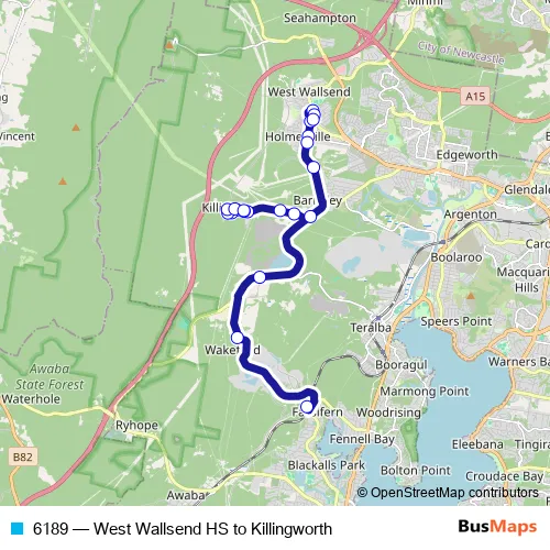 The first stop of the 6189 bus route is West Wallsend High School, Appletree Rd and the last stop is Fassifern Station, Tucker Cl. 6189 (West Wallsend HS to Killingworth) is operational during everyday.
