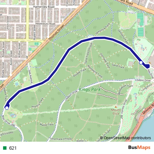 The first stop of the 621 bus route is May Dr Kings Park Anzac Day Shuttle and the last stop is May Dr Kings Park Anzac Day Shuttle. 621 is operational during everyday.