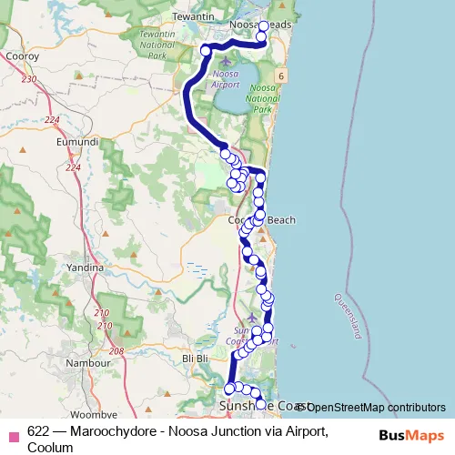 The first stop of the 622 bus route is Maroochydore station, platform 2 and the last stop is Noosa Junction station, stop A. 622 (Maroochydore - Noosa Junction via Airport, Coolum) is operational during everyday.