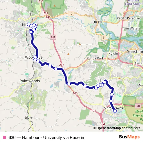 The first stop of the 636 bus route is Unisc station, platform 2 and the last stop is Nambour station. 636 (Nambour - University via Buderim) is operational during on weekdays.