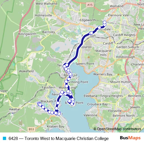 The first stop of the 6428 bus route is High St After Sunderland St and the last stop is Macquarie College. 6428 (Toronto West to Macquarie Christian College) is operational during on weekdays.