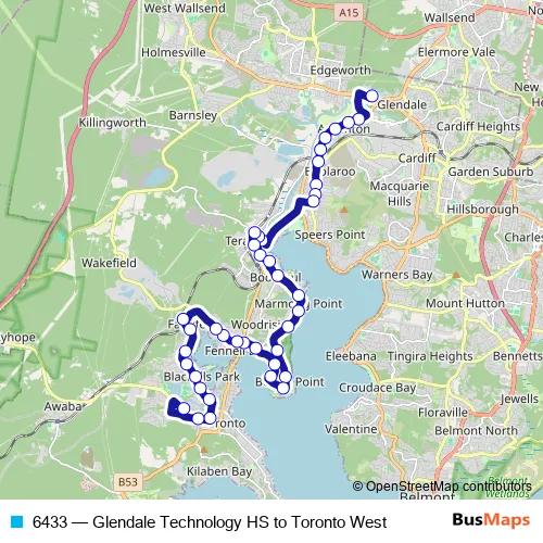The first stop of the 6433 bus route is Glendale Tech High School Bus Bay, Clare St and the last stop is Toronto High School, Awaba Rd. 6433 (Glendale Technology HS to Toronto West) is operational during everyday.