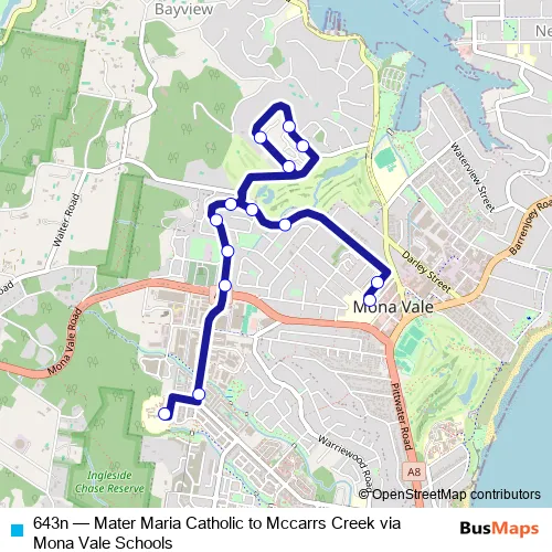 The first stop of the 643n bus route is Mona Vale Public School, Waratah St and the last stop is Mater Maria College. 643n (Mater Maria Catholic to Mccarrs Creek via Mona Vale Schools) is operational during on weekdays.