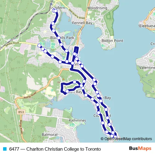 The first stop of the 6477 bus route is Charlton Christian College, Fassifern Rd and the last stop is Awaba Rd Opp Sunderland Rd. 6477 (Charlton Christian College to Toronto) is operational during on weekdays.