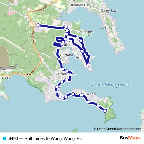 The first stop of the 6490 bus route is Dorrington Rd Opp Karoonda Pl and the last stop is Dobell Dr At Reserve Rd. 6490 (Rathmines to Wangi Wangi Ps) is operational during on weekdays.