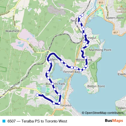 The first stop of the 6507 bus route is Teralba Public School, William St and the last stop is Biraban Public School, Beckley St. 6507 (Teralba PS to Toronto West) is operational during on weekdays.