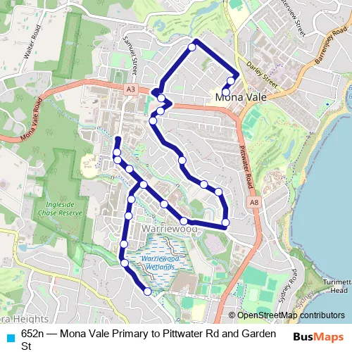 The first stop of the 652n bus route is Mona Vale Public School, Waratah St and the last stop is Katoa Reserve, Garden St. 652n (Mona Vale Primary to Pittwater Rd and Garden St) is operational during on weekdays.