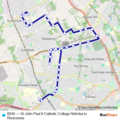 The first stop of the 6534 bus route is Wyndham College, Nirimba Campus, Eastern Rd and the last stop is St Johns Primary School, Mcculloch St. 6534 (St John Paul II Catholic College Nirimba to Riverstone) is operational during on weekdays.