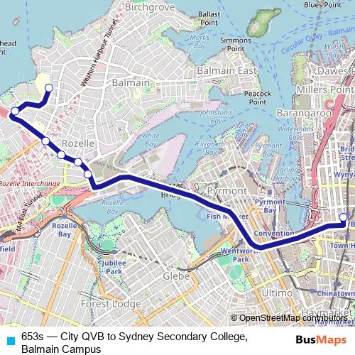 The first stop of the 653s bus route is Qvb, York St, Stand C and the last stop is Sydney Secondary College Balmain Campus, Terry St. 653s (City QVB to Sydney Secondary College, Balmain Campus) is operational during on weekdays.