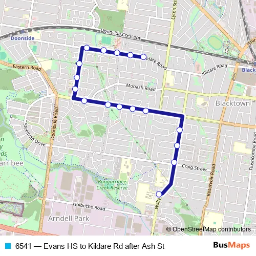 The first stop of the 6541 bus route is Evans High School Bus Bay, Walters Rd and the last stop is Kildare Rd After Ash St. 6541 (Evans HS to Kildare Rd after Ash St) is operational during on weekdays.