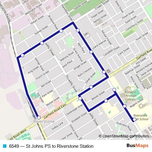 The first stop of the 6549 bus route is St Johns Primary School, Mcculloch St and the last stop is Riverstone Pde Opp Riverstone Station. 6549 (St Johns PS to Riverstone Station) is operational during on weekdays.