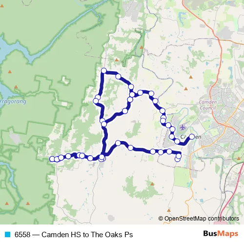 The first stop of the 6558 bus route is Camden High School, Cawdor Rd and the last stop is Argyle St At Elizabeth St. 6558 (Camden HS to The Oaks Ps) is operational during on weekdays.