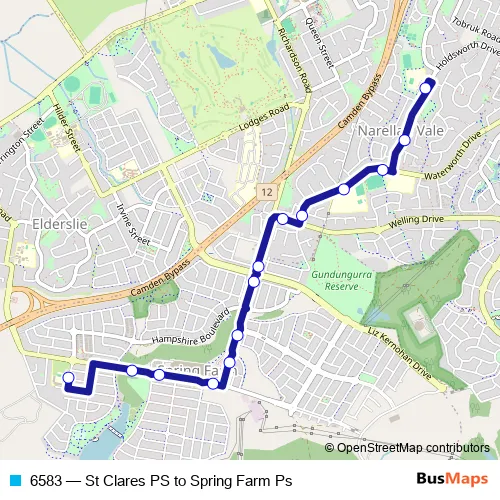 The first stop of the 6583 bus route is St Clares PS (Bus Bay) and the last stop is Spring Farm Public School, Barley Rd. 6583 (St Clares PS to Spring Farm Ps) is operational during on weekdays.