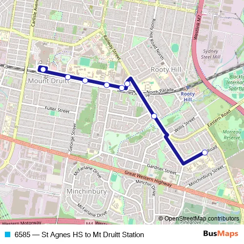 The first stop of the 6585 bus route is St Agnes Catholic High School, Evans Rd and the last stop is Mount Druitt Station, Stand C. 6585 (St Agnes HS to Mt Druitt Station) is operational during on weekdays.