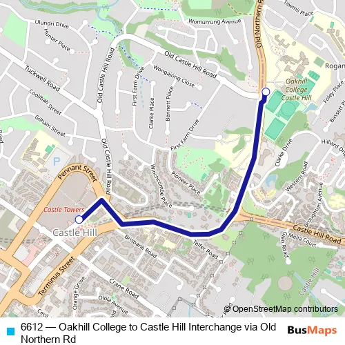 The first stop of the 6612 bus route is Oakhill College, Old Northern Rd and the last stop is Castle Hill Station, Old Castle Hill Rd, Stand E. 6612 (Oakhill College to Castle Hill Interchange via Old Northern Rd) is operational during on weekdays.