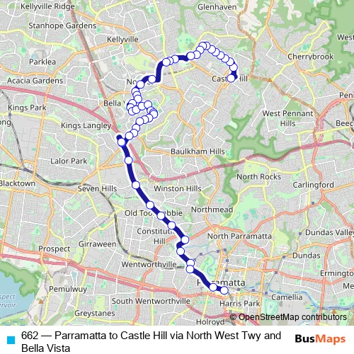 The first stop of the 662 bus route is Castle Hill Station, Old Northern Rd, Stand A and the last stop is Parramatta Station, Stand A1. 662 (Parramatta to Castle Hill via North West Twy and Bella Vista) is operational during everyday.