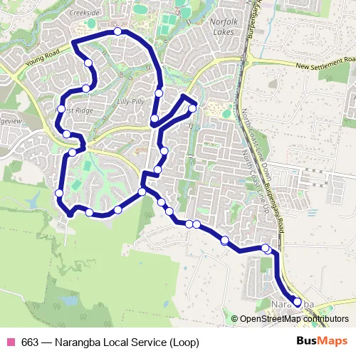 The first stop of the 663 bus route is Narangba station and the last stop is Narangba station. 663 (Narangba Local Service (Loop)) is operational during everyday.
