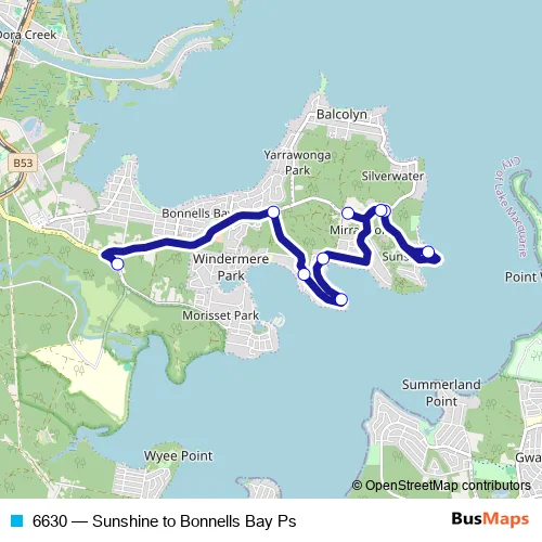 The first stop of the 6630 bus route is Fishery Point Rd Opp Hillcrest Rd and the last stop is Bonnells Bay Public School, Morisset Park Rd. 6630 (Sunshine to Bonnells Bay Ps) is operational during on weekdays.
