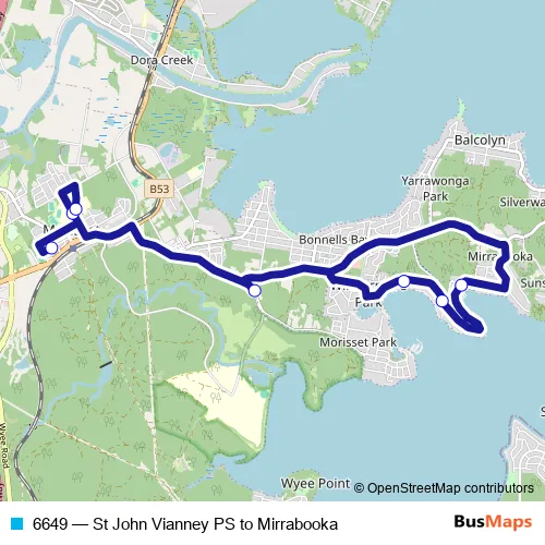 The first stop of the 6649 bus route is St John Vianney Primary School, Yambo St and the last stop is Bonnells Bay Public School, Morisset Park Rd. 6649 (St John Vianney PS to Mirrabooka) is operational during on weekdays.