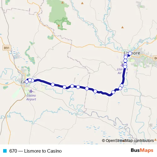 The first stop of the 670 bus route is Lismore Transit Centre, Molesworth St and the last stop is Casino Shopping Plaza, Canterbury St. 670 (Lismore to Casino) is operational during on weekdays.