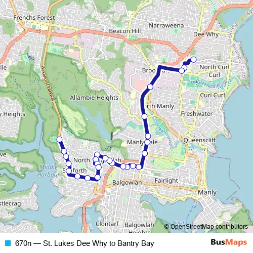 The first stop of the 670n bus route is St Luke's Grammar School, Headland Rd and the last stop is Seaforth Oval, Wakehurst Pkwy. 670n (St. Lukes Dee Why to Bantry Bay) is operational during on weekdays.