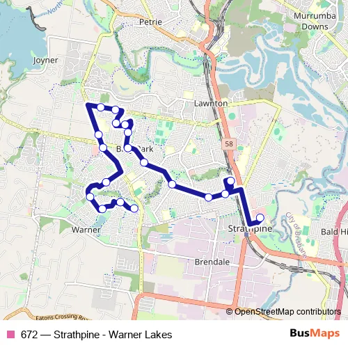 The first stop of the 672 bus route is Strathpine bus station, stop A and the last stop is Russet Burbank Pde near Delawar Rd. 672 (Strathpine - Warner Lakes) is operational during everyday.