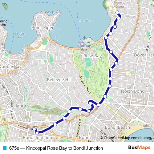 The first stop of the 675e bus route is New South Head Rd At Towns Rd and the last stop is Bondi Junction Station, Stand P. 675e (Kincoppal Rose Bay to Bondi Junction) is operational during on weekdays.