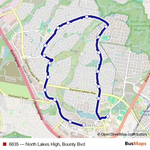 The first stop of the 6835 bus route is North Lakes State College and the last stop is North lakes arrivals stop. 6835 (North Lakes High, Bounty Bvd) is operational during on weekdays.