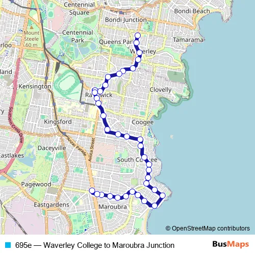 The first stop of the 695e bus route is Waverley College, Carrington Rd and the last stop is Pacific Square, Anzac Pde. 695e (Waverley College to Maroubra Junction) is operational during on weekdays.