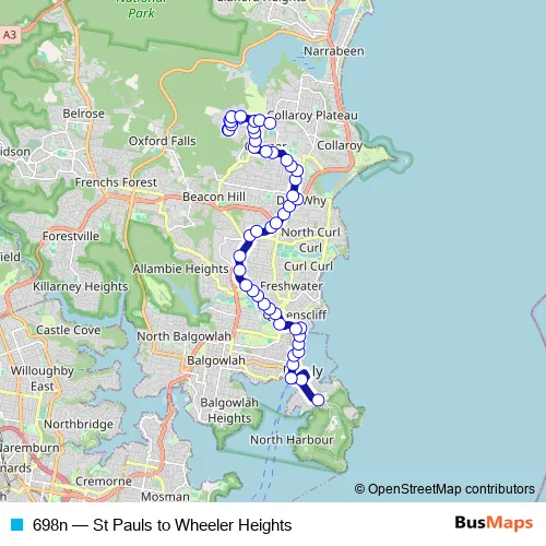 The first stop of the 698n bus route is St Pauls College, Darley Rd and the last stop is South Creek Rd Opp Toronto Av. 698n (St Pauls to Wheeler Heights) is operational during on weekdays.
