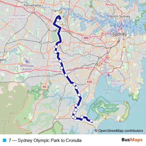 The first stop of the 7 bus route is Shark Park, Captain Cook Dr and the last stop is Sydney Olympic Park, Plaza Terminal, Stand 7. 7 (Sydney Olympic Park to Cronulla) is operational during everyday.
