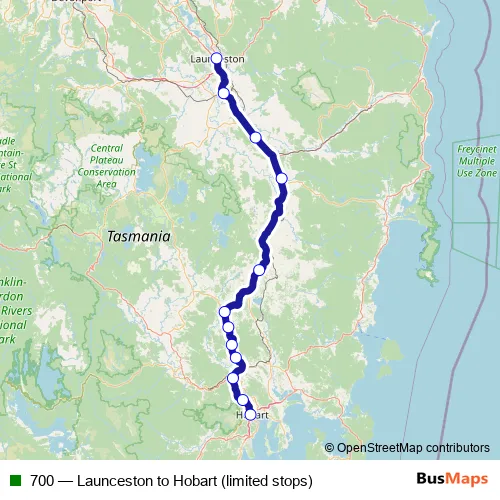 The first stop of the 700 bus route is Launceston Regional Transit Centre, Stop L2 and the last stop is Hobart Transit Centre, Liverpool St. 700 (Launceston to Hobart (limited stops)) is operational during on weekdays.