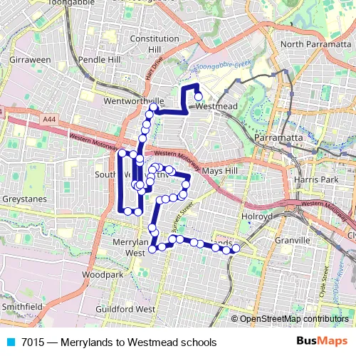 The first stop of the 7015 bus route is Merrylands Interchange, Terminal Pl - Stand 2 and the last stop is Westmead Schools Bus Bay. 7015 (Merrylands to Westmead schools) is operational during on weekdays.
