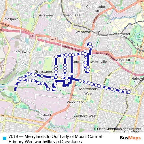 The first stop of the 7019 bus route is Merrylands Interchange, Terminal Pl - Stand 1 and the last stop is Our Lady Of Mount Carmel Primary School, Smith St. 7019 (Merrylands to Our Lady of Mount Carmel Primary Wentworthville via Greystanes) is operational during on weekdays.