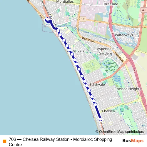 The first stop of the 706 bus route is Mordialloc SC/Centre Way and the last stop is Chelsea Station/Station St. 706 (Chelsea Railway Station - Mordialloc Shopping Centre) is operational during on weekdays.