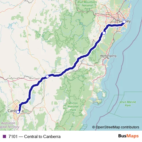 The first stop of the 7101 bus route is Central Station, Forecourt, Coach Bay 1 and the last stop is Canberra Station, Coach Stop. 7101 (Central to Canberra) is operational during on weekends.