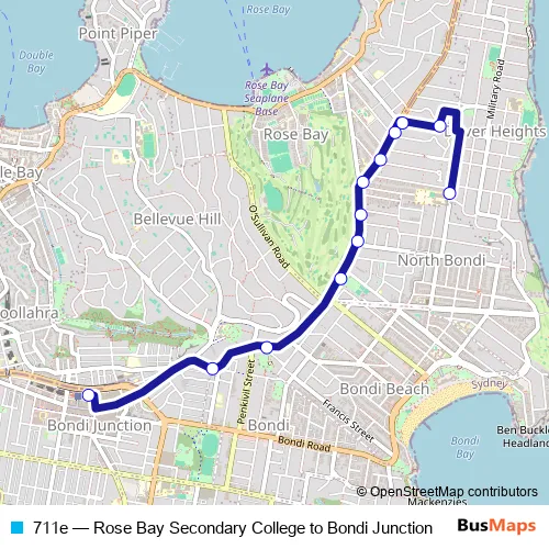 The first stop of the 711e bus route is Rose Bay Secondary College, Stand 2, Hardy St and the last stop is Bondi Junction Station, Stand P. 711e (Rose Bay Secondary College to Bondi Junction) is operational during on weekdays.
