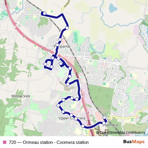 The first stop of the 720 bus route is Coomera station, stop D and the last stop is Ormeau station. 720 (Ormeau station - Coomera station) is operational during everyday.