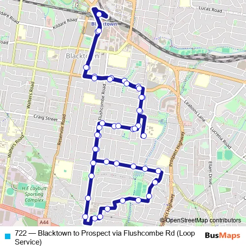 The first stop of the 722 bus route is Blacktown Station, Stand E and the last stop is Blacktown Station, Stand E. 722 (Blacktown to Prospect via Flushcombe Rd (Loop Service)) is operational during everyday.