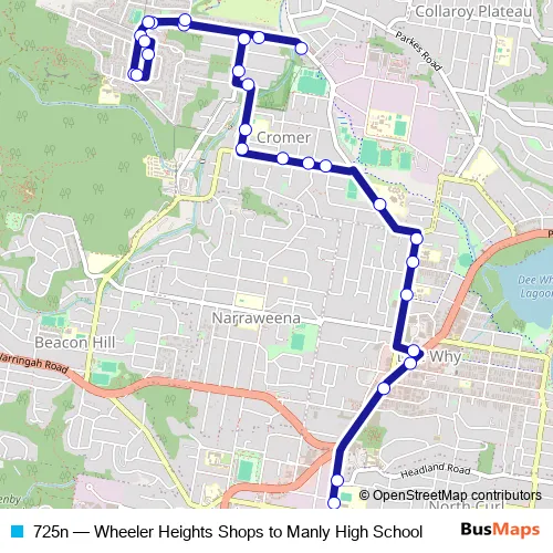 The first stop of the 725n bus route is South Creek Rd After Toronto Av and the last stop is Nbsc Manly Campus, Harbord Rd. 725n (Wheeler Heights Shops to Manly High School) is operational during on weekdays.
