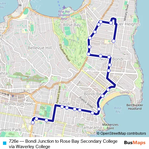The first stop of the 726e bus route is Rose Bay Secondary College, Stand 2, Hardy St and the last stop is Waverley College, Carrington Rd. 726e (Bondi Junction to Rose Bay Secondary College via Waverley College) is operational during on weekdays.