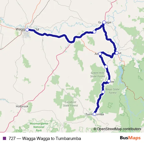 The first stop of the 727 bus route is Wagga Wagga Station, Coach Bay 3 and the last stop is Tumbarumba Coach Stop, Union Lane. 727 (Wagga Wagga to Tumbarumba) is operational during everyday.