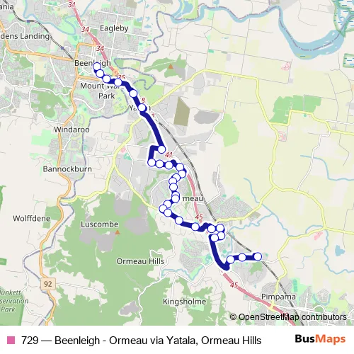 The first stop of the 729 bus route is Beenleigh station, stop B and the last stop is Ormeau station. 729 (Beenleigh - Ormeau via Yatala, Ormeau Hills) is operational during everyday.
