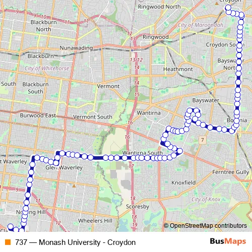 The first stop of the 737 bus route is Monash University and the last stop is Croydon Station/Railway Ave. 737 (Monash University - Croydon) is operational during everyday.