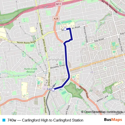 The first stop of the 740w bus route is Carlingford High School, North Rocks Rd and the last stop is Pennant Hills Rd Opp Lloyds Av. 740w (Carlingford High to Carlingford Station) is operational during on weekdays.