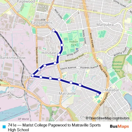 The first stop of the 741e bus route is Bunnerong Rd Before Fitzgerald Av and the last stop is Matraville High School, Burke St. 741e (Marist College Pagewood to Matraville Sports High School) is operational during on weekdays.