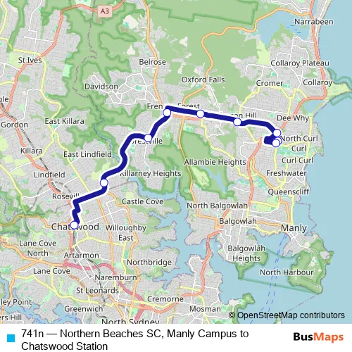 The first stop of the 741n bus route is Nbsc Manly Campus, Harbord Rd and the last stop is Chatswood Station, Stand D. 741n (Northern Beaches SC, Manly Campus to Chatswood Station) is operational during on weekdays.