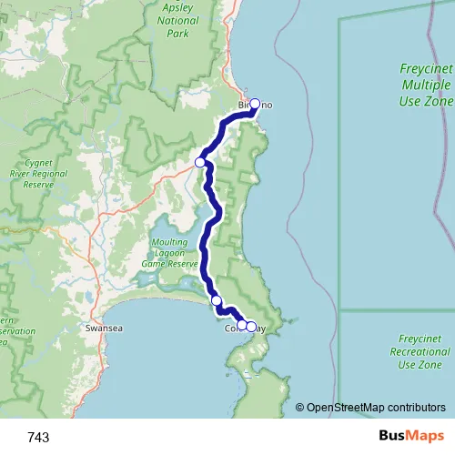 The first stop of the 743 bus route is No.41b Foster St (Bicheno Information Centre) and the last stop is Freycinet Visitor Centre, Freycinet Dr. 743 is operational during everyday.
