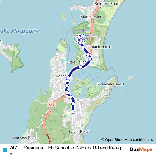 The first stop of the 747 bus route is Swansea High School, Park Av and the last stop is Soldiers Rd Opp Karog St. 747 (Swansea High School to Soldiers Rd and Karog St) is operational during on weekdays.