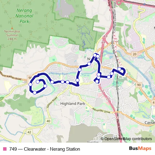 The first stop of the 749 bus route is Dugandan St at Burra Street and the last stop is Nerang station. 749 (Clearwater - Nerang Station) is operational during on weekdays.